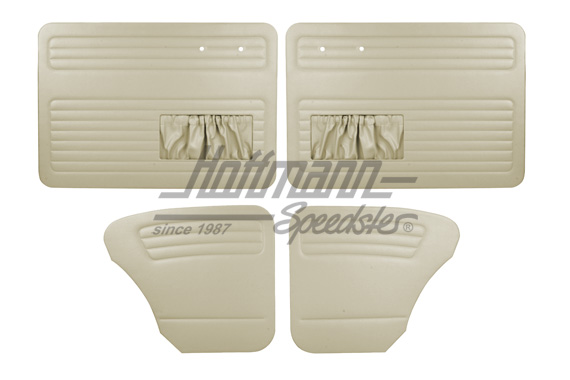 Der Satz besteht aus 2 vorderen Türverkleidungen mit Taschen und 2 hinteren Seitenverkleidungen aus Vinyl. Die mit weichem Schaumstoff gepolsterten Verkleidungen haben verschweißte Nähte. Öffnungen für Fensterkurbel und Griffe sind eingearbeitet.